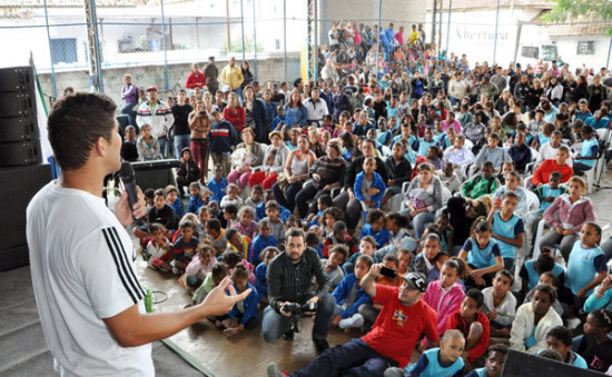 O campeão do The Ultimate Fighter (TUF) Brasil 2, Léo Santos, ministrou uma palestra na tarde desta quinta-feira (15) para cerca de 700 crianças, adolescentes e jovens atendidos pelos programas da Fundação Municipal da Infância e da Juventude (FMIJ). O lutador se emocionou ao ser recebido com euforia pelos presentes, que consideram o “Lamparão Bom de Briga” um exemplo a ser seguido.