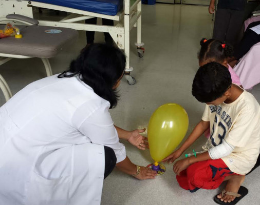 A terapeuta ocupacional percorreu as enfermarias da Clínica Pediátrica do hospital envolvendo pacientes e acompanhantes em atividades lúdicas e ensinando as mães a confeccionarem brinquedos para seus filhos utilizando bexigas e materiais recicláveis, como canudos, papéis e latinhas.