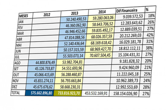 Nos sete primeiros meses de 2014, a Prefeitura já injetou na economia do município R$ 453.532.169,91. De agosto de 2013 a julho de 2014, foram R$ 733.816.923,70, enquanto que, um ano antes, o valor era de R$ 575.662.896,80, o que representa um crescimento vegetativo da folha de pagamento de R$ 158.154.026,90.