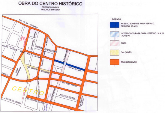 A partir da próxima segunda-feira (18) até sábado (23), a Rua 21 de Abril, no cruzamento com a Rua dos Andradas, será interditada para a realização das obras de revitalização do Centro Histórico de Campos. A informação é do diretor de Projetos Viários do Instituto Municipal de Trânsito e Transportes (IMTT), Paulo Dias.