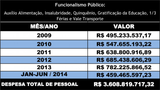 Auxílio alimentação e vale transporte - Outro benefício importante, que também deu um salto superior a R$ 7 milhões de 2009 para 2013, foi o auxílio alimentação: saiu de R$ 25.041.451.50 para R$ 32.522.412,72. De janeiro a junho deste ano, já foram pagos R$ 16.647.317.27. Mais um benefício que cresceu foi o Vale Transporte, que saiu de R$ 9.019.555,13 para R$ 9.394.391.19 no ano passado. Nos seis primeiros meses de 2014, já são R$ 4.534.815.88.