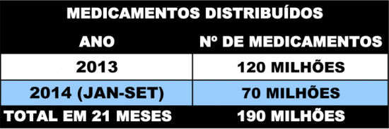 O Departamento de Assistência Farmacêutica (DAF) da Secretaria de Saúde distribuiu mais de 190 milhões de itens de medicamentos em 2013 e em 2014. Desse total, aproximadamente 70 milhões foram dispensados de janeiro a setembro deste ano. Em todo o ano passado, foram entregues cerca de 120 milhões de itens de graça, promovendo mais de 2 milhões de atendimentos.