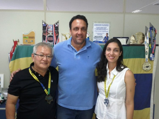 O mestre de karatê, Tetsuo, que é contemplado com o Bolsa Técnico da Fundação Municipal de Esportes (FME), faturou uma medalha de bronze da categoria master, no Campeonato Brasileiro de Karatê, realizado em Brasília. Eles foram recebidos pelo presidente da FME, André Ferreira (Pampa).