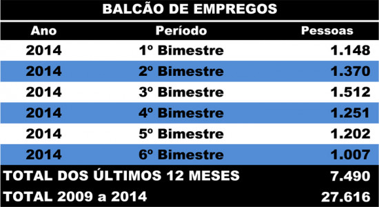 Através do Balcão de Empregos Municipal, 7.490 pessoas foram contratadas com carteira assinada em 2014. Entre 2009 e 2014, o Balcão de Empregos da Secretaria de Trabalho e Renda encaminhou cerca de 35 mil pessoas para 2.143 empresas cadastradas, das quais 27.616 foram contratadas.