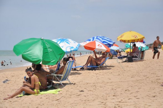 Turistas e veranistas aproveitam dia de sol e de mar calmo em Farol de São Tomé