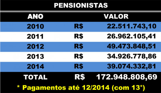 De janeiro de 2010 a dezembro de 2014, a Prefeitura de Campos destinou R$ 172.948.808,69 a pensionistas. Somente em 2014, foram pagos R$ 39.074.332,81. Em 2010 foram R$ 22,5 milhões, uma diferença de mais de R$ 16,5 milhões.