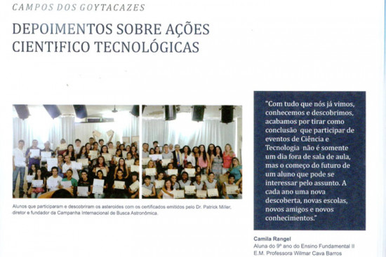 A revista publica, em duas páginas, a oportunidade que o município tem dado aos alunos da rede municipal de ensino e a comunidade em geral de participar de eventos ligados à Ciência e Tecnologia. Como realizações recentes em Campos, são citados: a 3ª edição da Semana Nacional de Ciência e Tecnologia de Campos e participação na campanha internacional de busca de asteroides, ambos realizados em 2014.