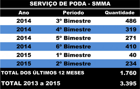 A Secretaria Municipal de Meio Ambiente podou 3.395 árvores entre 2013 e 2015, nos bairros e distritos de Campos. Somente no ano passado foram registradas 2.113 podas, uma média de 176 árvores mês. Já nos dois primeiros bimestres de 2015 foram podadas 274 árvores, sendo 40 em janeiro e fevereiro e 234 em março e abril.