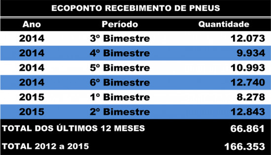 Para minimizar os danos às pessoas e ao meio ambiente, a Secretaria de Limpeza Pública, Praças e Jardins recolhe mais de 5 mil pneus por mês, através do EcoPonto. Nos últimos 12 meses, foram recolhidos 66.861 pneus e, de 2012 a 2015, foram 166.353.