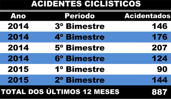 De acordo com a FMS nos dois primeiros bimestres de 2015 o número de acidentes envolvendo bicicletas chegou a 234, sendo 90 em janeiro e fevereiro e 144 em março e abril. No período, 207 ciclistas foram atendidos no hospital, somente em setembro e outubro de 2014, meses que registrou o maior número de vítimas.