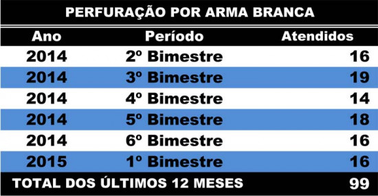Somente nos meses de janeiro e fevereiro deste ano, o HFM atendeu 16 casos de perfuração por arma branca. De acordo com os dados da FMS nos últimos cinco anos o HFM chegou a atender a 680 casos. Apenas em 2009 esse número chegou a 184.