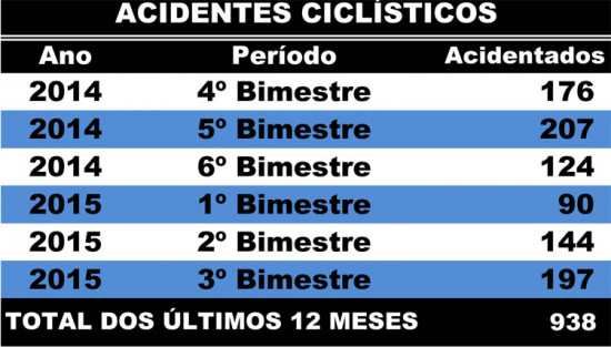 De acordo com os dados da FMS, apenas no 3º bimestre deste ano, o HFM atendeu 197 ciclistas que sofreram acidentes nas ruas de Campos e de municípios do Norte Fluminense. No período de 12 meses, foi no 1º bimestre de 2015 que se registrou o menor número de acidentes envolvendo bicicletas, 90.