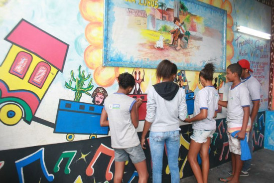 Alunos do Ciep Villa-Lobos pintam painel em parede da escola
