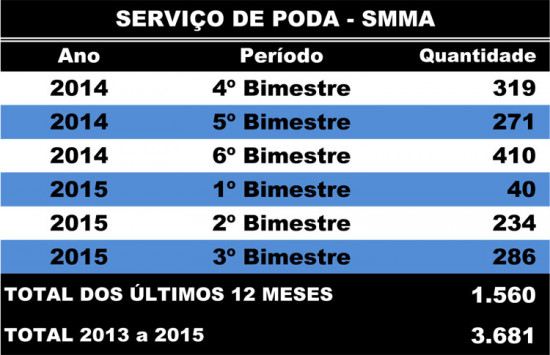 De acordo com a Secretaria Municipal de Desenvolvimento Ambiental, nos últimos 12 meses foram realizadas 1.560 podas de árvores em Campos, sendo 410 no 6º bimestre de 2014. Nos três primeiros bimestres deste ano, o número de poda de árvores já chegou a 560, sendo 40 no 1º bimestre, 234 no 2º bimestre e 286 no 3º.