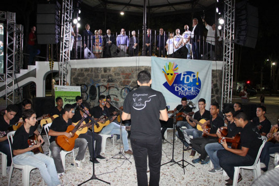 A Orquestra de Violões do Instituto Federal Fluminense (IFF) participou da abertura do Festival Doces Palavras, executando o hino nacional, nesta quarta-feira (23), no Jardim do Liceu. As participações dos 20 componentes regidos pelo maestro Victor Matos foi além. No repertório canções de sucesso da MPB e músicas internacionais com novas versões.