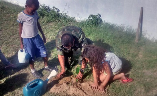 Crianças plantam árvores frutíferas na Escola Julião Nogueira