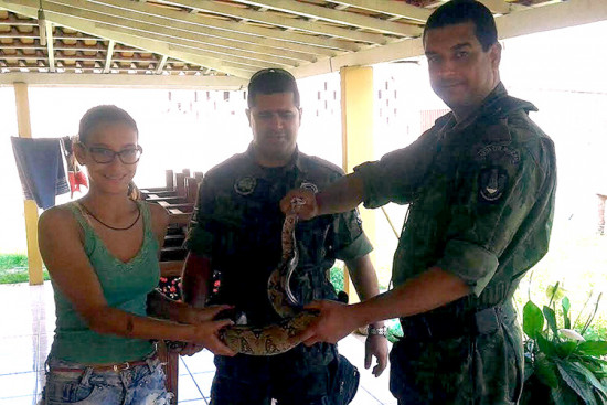 Uma cobra jibóia, medindo cerca de 1.60m, foi resgatada na tarde deste sábado (26) pelo Grupamento Ambiental (GAM) da Guarda Civil Municipal, em uma residência na localidade de Poço Gordo, na Baixada Campista. O animal silvestre estava atrás da máquina de lavar e foi encontrada pela dona da casa, Renata Rosa de Abreu. Segundo o comandante do GAM, o biólogo Sávio Tatagiba, a jiboia já foi levada ao Núcleo de Estudo e Pesquisa de Animais Silvestres (Nepas), da Universidade Estadual do Norte Fluminense Darcy Ribeiro (Uenf) para avaliação veterinária e posterior soltura, quando estiver apta para ser devolvida à natureza.