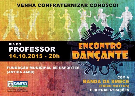 O Dia do Professor, lembrado em 15 de outubro, será comemorado em Campos com um Encontro Dançante, para os professores da rede municipal de ensino. O evento está marcado para a próxima quarta-feira (14), a partir das 20h, na Fundação Municipal de Esportes. Os interessados em participar da festa podem retirar a pulseirinha para entrada, no gabinete da Secretaria Municipal de Educação, Cultura e Esportes (Smece), a partir desta terça-feira (6), até a sexta-feira (9). Basta apresentar carteira de identidade e contracheque.
