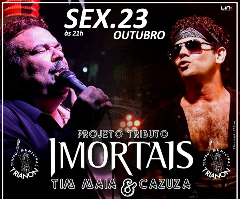 O Teatro Trianon apresentará, nesta sexta-feira (23), às 21h, o show “Projeto Tributo Imortais – Tim Maia e Cazuza”. Os ingressos custam R$ 60,00 (inteira) e R$ 30,00 (meia) e estão à venda, na bilheteria do teatro.