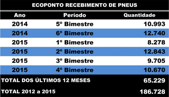 A Secretaria de Desenvolvimento Ambiental realizou nos últimos quatro anos, o recolhimento de 186.728 pneus no EcoPonto. Somente este ano foram 41.496 pneus recolhidos, e nos últimos 12 meses, 65.229. Muitos dos pneus foram recolhidos em terrenos baldios, canais, rios e lagoas. O trabalho evita a proliferação de mosquitos transmissores de doença, como o Aedes aegypti, transmissor da dengue e da chikungunya.