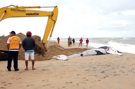 Uma máquina retroescavadeira foi utilizada para abrir uma cova com 3m de profundidade, na própria areia da praia, a 50m da maré alta, onde os animais foram encontrados. De acordo com os biólogos, a distância ideal para serem enterradas seria a 100m da maré mas, pelo avançado estado de decomposição, se removidos, os animais desintegrariam.