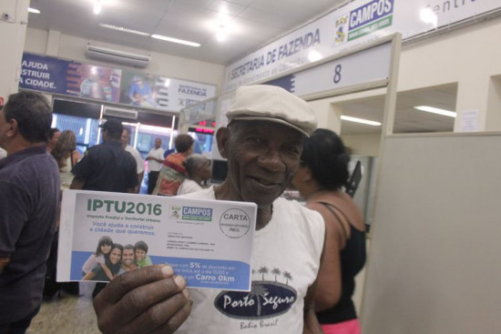 O movimento tem sido grande na Secretaria Municipal de Fazenda, com os contribuintes buscando o carnê para o pagamento do IPTU em cota única. O prazo para o pagamento com 5% de desconto termina nesta quinta-feira (10), e o contribuinte concorre a um carro zero modelo Sandero, da Renault. O sorteio vai ser realizado no dia 28 de março, data em que Campos comemora 181 anos de elevação de Vila de São Salvador à categoria de cidade.