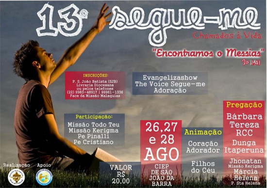 Continuam abertas as inscrições para o 13º “Segue-me – Chamados à vida”, que acontece nos dias 26, 27 e 28, no Ciep 265 Municipalizado Professora Gladys Teixeira, no município de São João da Barra. Os interessados têm até o dia 19 para garantir sua participação.