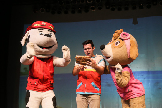 No palco, com a ajuda de imagens projetadas ao fundo para "formatar" os ambientes das histórias, Ryder "viveu" emocionantes aventuras, como a que salva, com a ajuda dos cãezinhos amigos, o capitão Rodovalho, que caiu na "caverna do pirata". E assim foi nas demais "ações heroicas" do menino, sempre com o apoio do dálmata Marshall, do bulldog inglês Rudlle, do pastor alemão Chase, do labrador Zuma, da cadela destemida Skye e do vira-lata Rocky.