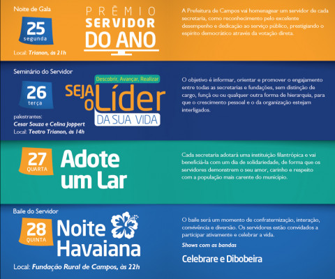 Fechando as comemorações da XI Semana do Servidor, na quinta-feira (28), Dia do Servidor Público, a prefeitura realiza o Baile do Servidor, a partir das 22h, na Fundação Rural de Campos. “Noite Havaiana” é o tema da festa, escolhido em reunião com os organizadores do evento e representantes das secretarias e fundações. Está sendo preparada uma grande festa para servidores e acompanhantes, animados pela Banda Celebrare, o grupo campista Dibobeira e, nos intervalos, Djs.