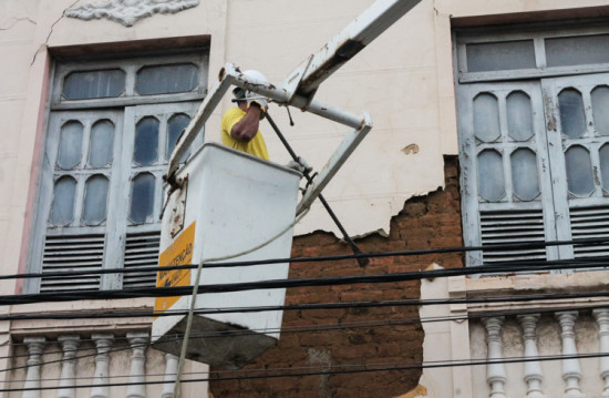Defesa Civil remove parte da fachada de prédio no Centro