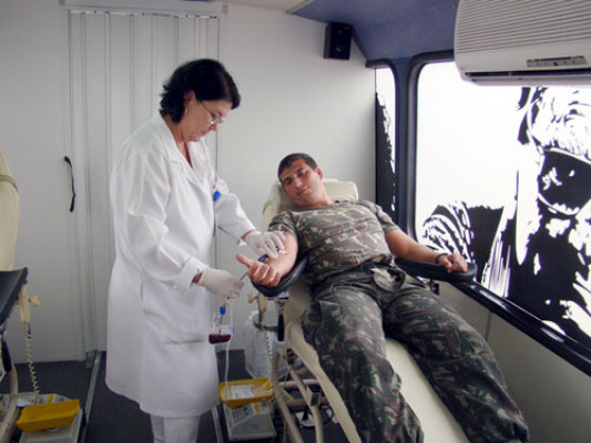 Teve início nesta quarta-feira (27) a parceria firmada entre o 56º Batalhão de Infantaria e o Hemocentro Regional de Campos, que prevê idas mensais da unidade móvel de coleta de sangue ao batalhão do exército. Durante todo o dia, a unidade móvel permaneceu no batalhão, coletando 32 bolsas de sangue. Entre os doadores, militares como o sargento Cristiano Caxéro, que aprovou a iniciativa do comandante do 56º BI, tenente-coronel Júlio César Evangelista dos Santos, que pretende organizar grupos mensais de doadores entre seus comandados. “A vinda da unidade móvel ao Exército vai facilitar bastante para nossos doadores”, diz Caxéro.