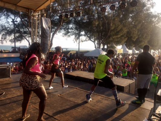 O grupo de dança Ragha subiu ao palco oficial, montado na Avenida Atlântica, em frente ao muro da Marinha, no Farol de São Thomé. O grupo se apresenta todos os sábados às 17h, levando o público a se exercitar com vários hits