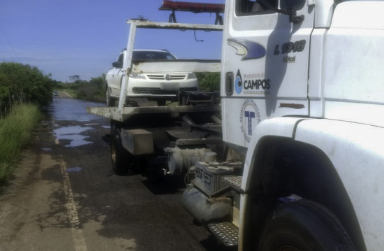 Caminhão prancha auxilia travessia de veículos em área alagada da RJ-180