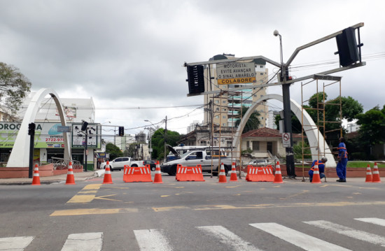 Trânsito flui em meia pista até que a substituição do semáforo, danificado por acidente, possa ser realizada.