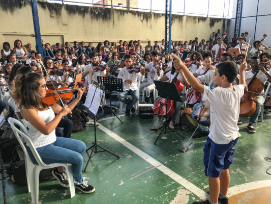 O projeto, lançado ano passado, escolheu a quadra da escola municipal Albertina Azeredo Venâncio para sediar a apresentação, composta por sete músicas, dinâmicas com os estudantes e encerrada como uma grande festa, ao som de Aquarela do Brasil e marchinhas de carnaval, encantando estudantes e professores. Entre todos os alunos que assistiam um ponto em comum: o deslumbramento de ouvir uma orquestra ao vivo pela primeira vez.