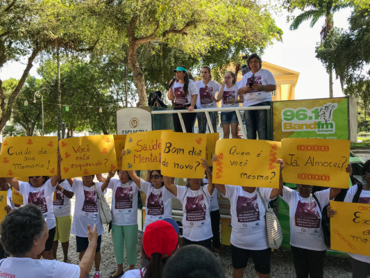 Mais de 100 idosos participaram da caminhada, exibindo cartazes com frases do cotidiano de quem sofre com a doença. Na chegada, no Jardim do Liceu, teve aulão de alongamento e palestra.
