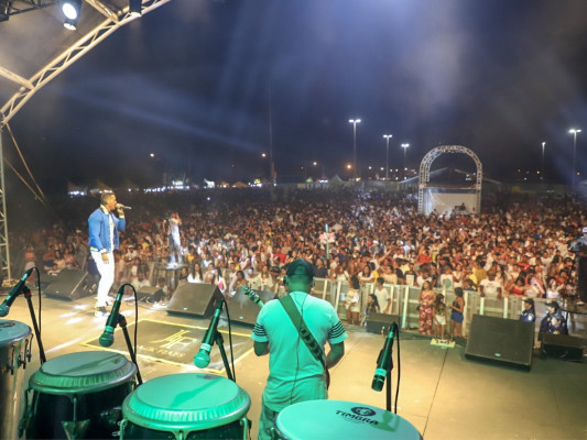 Com batidas precisas da percussão e muito gingado, o cantor se apresentou para milhares de pessoas que prestigiam a festa organizada pela Prefeitura de Campos.