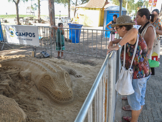 Talento e criatividade marcaram a abertura da exposição "Arte em Areia" neste sábado (5) na praia campista de Farol de São Tomé, pelo Sesc Verão Alô Farol 2019. O evento atraiu muitos curiosos que fizeram questão de acompanhar o trabalho rico em detalhes do talentoso artista plástico morador do Pavão Pavãozinho, Rogean Rodrigues. A exposição segue até 28 de fevereiro na orla do Farol.