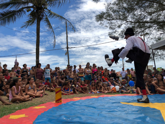 Todo domingo à tarde, duplas de palhaços visitam a Arena Kids, em Farol de São Thomé. Eles brincam, cantam e dançam durante cerca de uma hora com o público. O projeto faz parte da programação do Sesc Verão Alô Farol 2019.