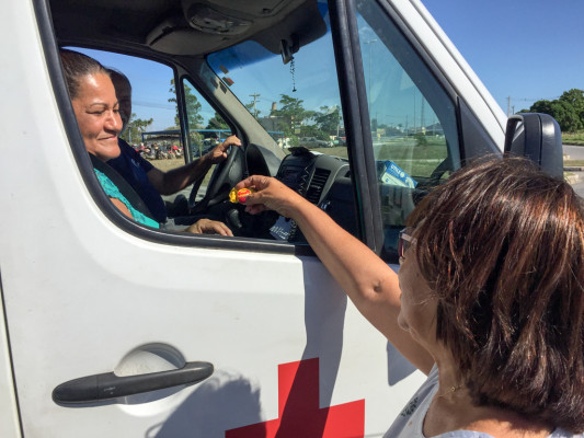 Uma guarnição feminina da Guarda Civil Municipal (GCM) também participou da atividade. Além de distribuição de rosas e bombons, ação contou ainda com aferição de pressão arterial e glicemia.