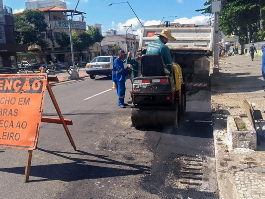 As equipes atuamo em frentes de serviços com os trabalhos pontuais na rede de drenagem, reparos nas calçadas, nos bueiros, na troca dos tampões, além dos reparos em asfalto e paralelepípedos