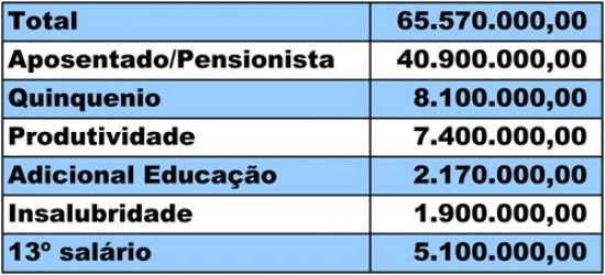 A Prefeitura fecha o ano de 2010 com um repasse de R$ 65,57 milhões para o pagamento de aposentados e pensionistas. No total de recursos provenientes dos cofres públicos, estão incluídos as duas parcelas do 13º salário e os principais direitos pagos em folha, como qüinqüênio, produtividade – pagos a fiscais de renda, transporte e obra, além de insalubridade, calculada com índices de 20% e 40% - e adicional de Educação para os professores aposentados.