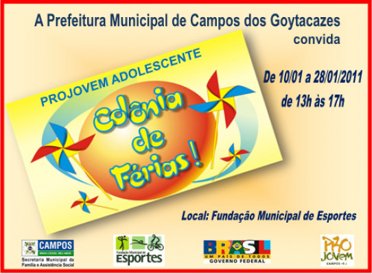 Começa na próxima segunda-feira (10) e prossegue até 28 de janeiro, das 13 às 17h, na Fundação Municipal de Esportes (FME), a Colônia de Férias do Projovem Adolescente-Campos. Além de garantir lazer aos jovens de 15 a 17 anos que participam do programa, durante a colônia de férias, adolescentes da mesma faixa etária terão a oportunidade de se inscrever no projeto sócio-educativo desenvolvido pela secretaria de Família e Assistência Social.