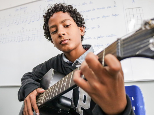 Os alunos do Ensino Fundamental II têm aulas de linguagem, percepção musical, canto, iniciação ao violão e ao teclado três vezes por semana. Eles farão apresentação pública.