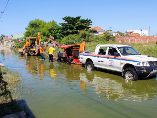 Defesa Civil e Secretaria de Infraestrutura escoam água de rua no Novo Jóquei