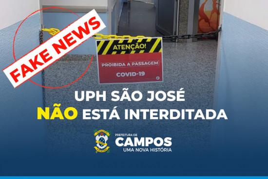 A Secretaria Municipal de Saúde informa que se trata de Fake News a informação de que a Unidade Pré-Hospitalar (UPH) São José está interditada que viralizou nesta quinta-feira (11) nas redes sociais e grupos de Whatsapp. A UPH São José é referência no atendimento à Covid-19 e atualmente há somente um paciente internado no Centro de Tratamento Intensivo (CTI) e nenhum na enfermaria. O atendimento segue dentro da normalidade.
