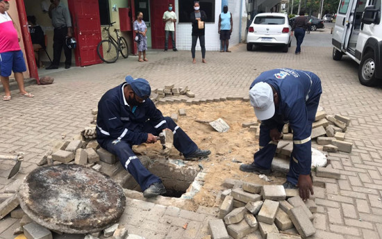 No local trabalhadores da secretaria realizam reparos no sistema de drenagem pluvial (águas das chuvas) e no pavimento do pátio, feito em bloquetes ecológicos de alto impacto