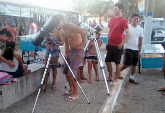 Não poderia ser diferente. Quem passava pelo calçadão do Farol, na área da Aldeia do Sol, na noite desta quinta-feira (10), quando o planetário do Clube de Astronomia Louis Cruls foi montado, não deixava de dar uma espiadinha na lua ou mesmo ver de perto o universo, com as devidas explicações dos especialistas na área, que contemplavam o público, especialmente o infantil.