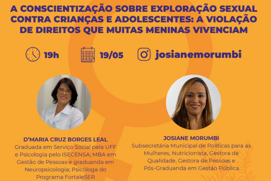 A live será conduzida pela secretária de Políticas para as Mulheres, Josiane Viana, em sua página do instagram @josianemorumbi e terá como tema “A conscientização sobre exploração sexual contra crianças e adolescentes