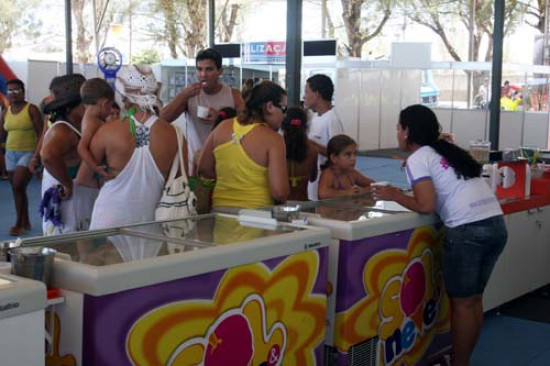 Centenas de crianças já se divertiram e se lambuzaram de delícias geladas de vários sabores e neste sábado de sol forte na praia campista, o local tem sido um point de muitas famílias, namorados e amigos, que se encontram , se divertem e batem um papo descontraído, na grande tenda instalada na orla, junto da pista interna da avenida Atlântica.